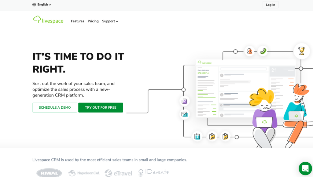 Livespace helps you plan, optimize, and control the sale process. It comprises two steps and lasts—according to the website—21 days; you can note a 36% increase in sales. The key features of the tool include facilitating teamwork, making sales forecasts as well as wise management. It is worth mentioning that Livespace is integrated into Sellizer.