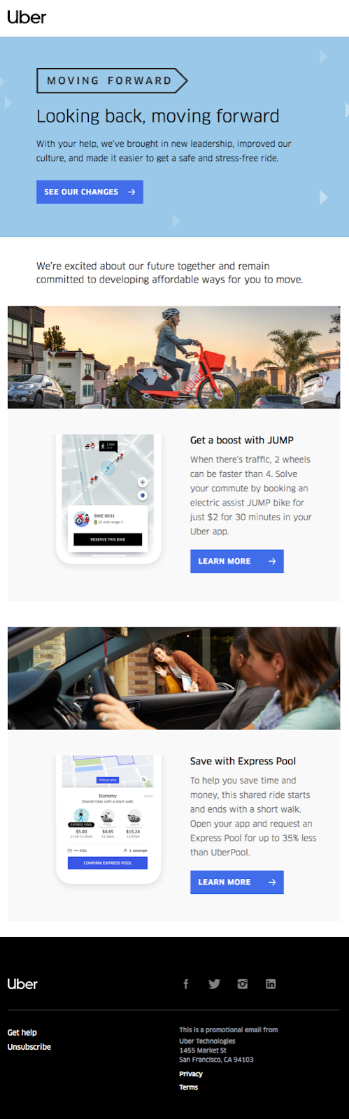 Having the total revenue of almost $3 billion dollars, Uber employs email campaigns on an ongoing basis to ensure that its clients remain engaged. What puts the corporation ahead of its competitors is its… simplicity. Concise alerts along with numerous call-to-action slogans are seemingly taking the market over. Informative, though approachable.