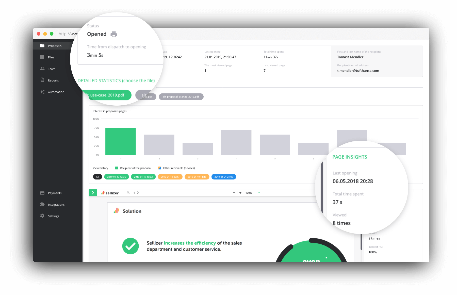 Sellizer is a comprehensive proposal tracking software. Extensive analytics allow you to track how long they were reading the offer, on which pages they spent the most time, which elements they skipped, if they shared the content with someone or if they printed it. It will help you customize the proposal accordingly and lead the discussion.