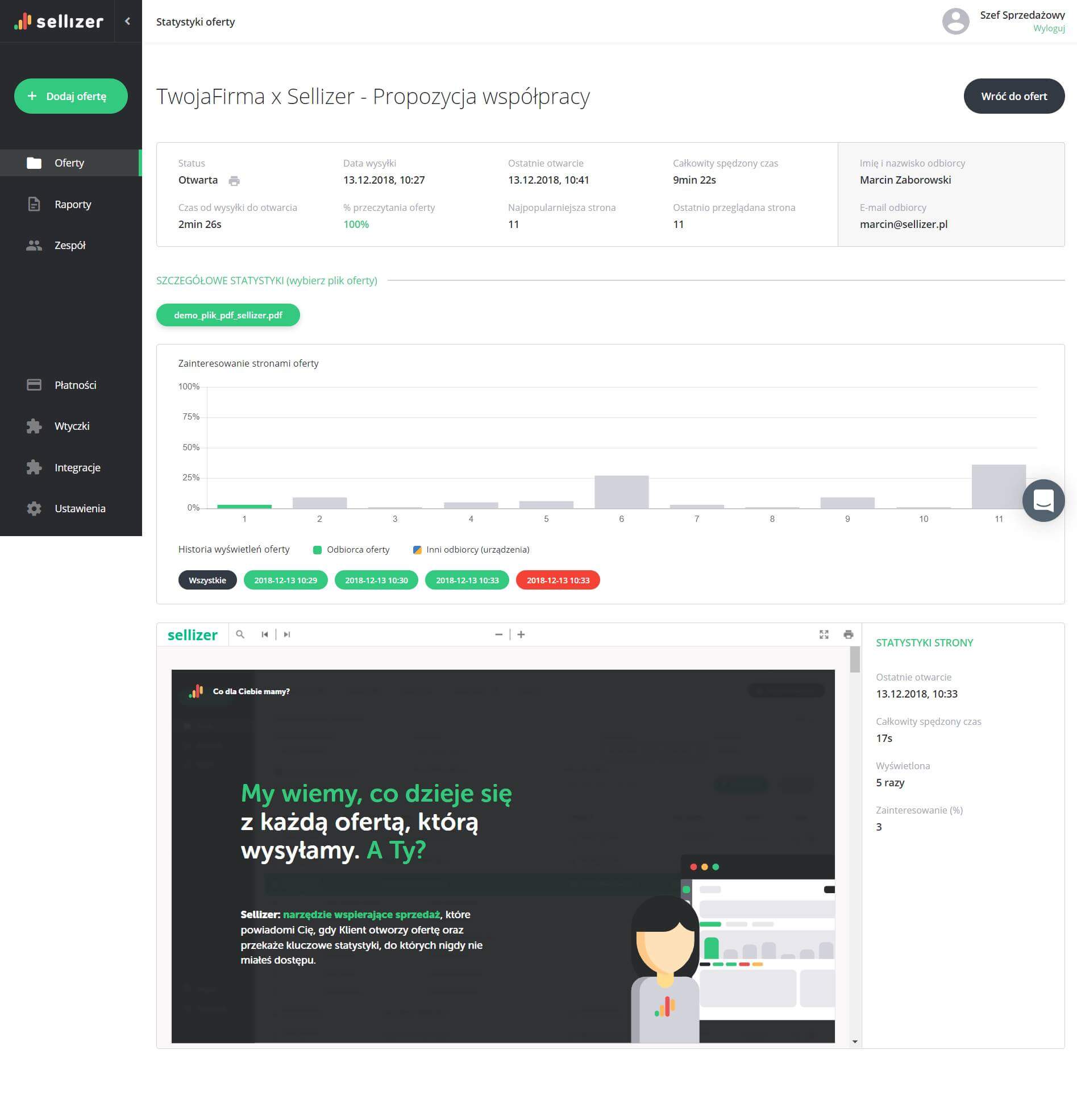 - Zyskujesz wiedzę przydatną do tworzenia bardziej skutecznych ofert w przyszłości. Możesz łatwo sprawdzić, na których stronach oferty Twój klient skupił się w pierwszej kolejności, a które całkowicie pominął. Może od razu przewinął całą ofertę na sam koniec, bo tam znajdowały się najbardziej istotne z jego punktu widzenia informacje? Taka powtarzająca się tendencja może być sugestią, że warto zmienić coś w ofercie. Być może będzie to zamiana kolejności slajdów, usunięcie pewnych informacji albo dodanie nowych?