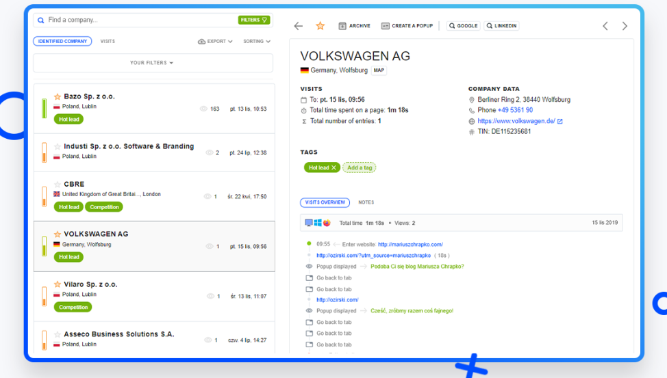 Jeśli jeszcze nie korzystasz z aplikacji do monitorowania ruchu na stronie – najwyższa pora. Aplikacje takie jak BAZO pomogą Ci uzupełnić lejek sprzedażowy o nowe, gorące kontakty wprost z Twojej strony internetowej. Dzięki takiemu rozwiązaniu dowiesz się, jakie firmy odwiedzają Twoją stronę, skąd przychodzą, jak często wracają, ile czasu poświęcają na wizytę. Poza podstawowymi danymi teleadresowymi, dostajesz także pełną historię wszystkich odwiedzin. Niektóre rozwiązania idą o krok dalej, oferując Ci możliwość wyszukania konkretnych pracowników danej firmy na portalach takich jak LinkedIn!