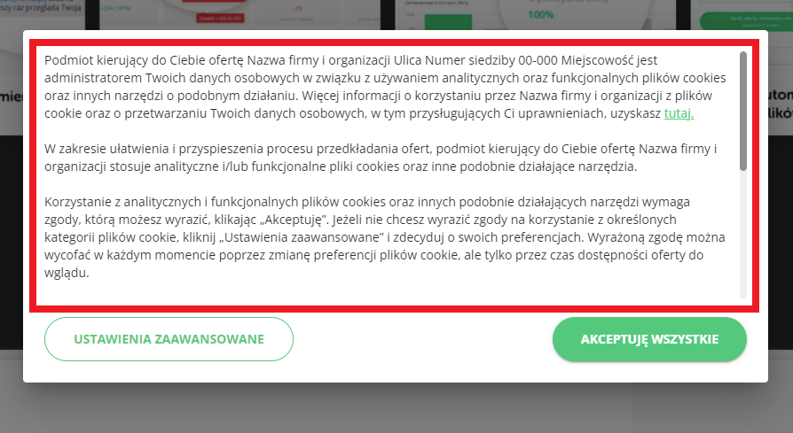 Pełna Klauzula informacyjna pojawia się po kliknięciu przed odbiorcę Twojej oferty w link “tutaj” w skróconej klauzuli. Możesz skorzystać z domyślnej zgody przygotowanej przez nas lub dodać swoją.