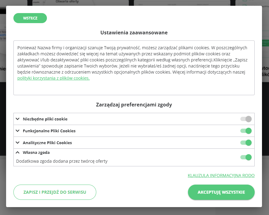 Przejdź do panelu “Organizacja”, a następnie do zakładki “Ustawienia domyślne”. W tym miejscu skonfigurujesz treści, elementy oraz sposób wyświetlania zgód odbiorcom Twoich ofert, możesz: