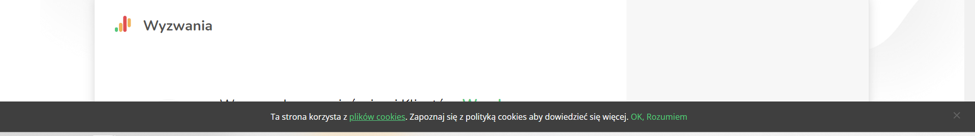 Dotychczas otwierając ofertę wyświetlany był osobie przeglądającej predefiniowany komunikat “Cookies”. Komunikat był czysto informacyjny i nie dało się go wyłączyć. Poniżej zaprezentowano przykładowy widok komunikatu.