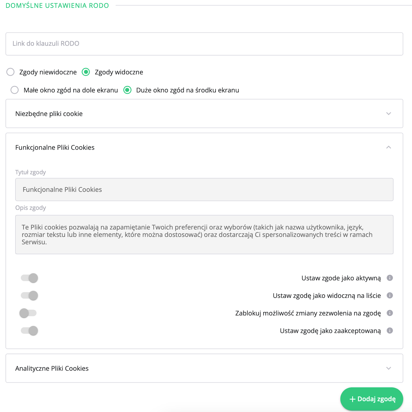 - wybrać sposób wyświetlania zgód (małe okienko na dole ekranu lub duże na środku ekranu),