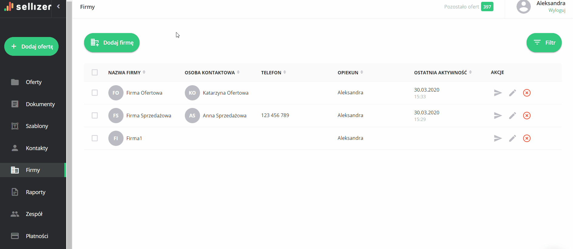 Oprócz kontaktów, w Sellizerze możesz teraz także tworzyć profile firm. W trakcie dodawania nowej firmy do Sellizera, zostaniesz poproszony o podanie osoby kontaktowej. W przypadku, gdy zdecydujesz się później na wysłanie oferty korzystając z opcji wysyłki do firmy, dane tej właśnie osoby zostaną automatycznie uzupełnione w polu odbiorcy. Inne dane, które możesz dodać podczas tworzenia firmy to dane adresowe, strona www czy notatka z dodatkowymi informacjami.
