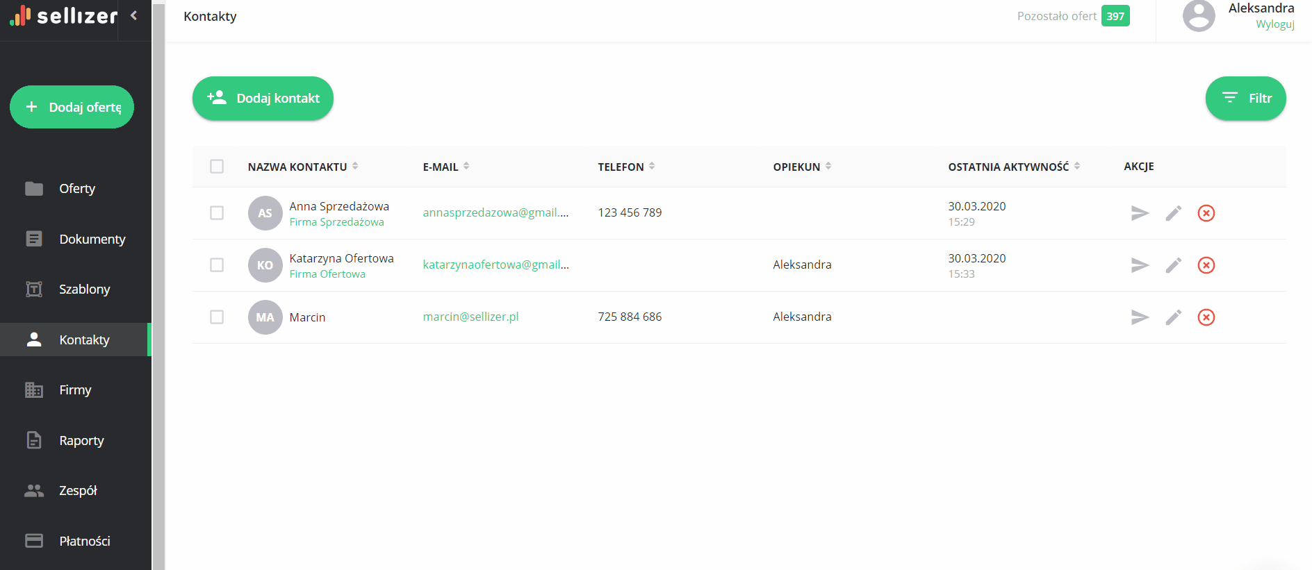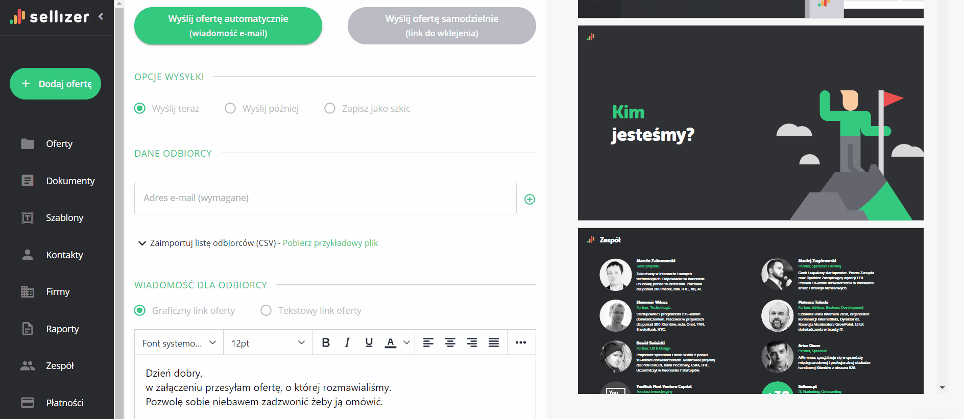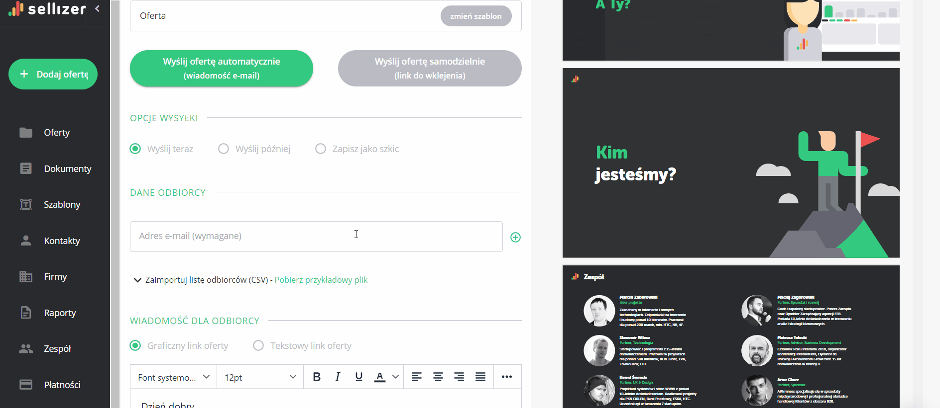 Możesz też przejść do zakładki Kontakty i odszukać, a następnie wybrać osobę, do której chcesz wysłać ofertę lub inny dokument. System przekieruje Cię do kreatora (oferty), gdzie musisz uzupełnić już tylko tytuł i treść wiadomości oraz wybrać sposób wysyłki. To wszystko - jest już gotowa do wysyłki!