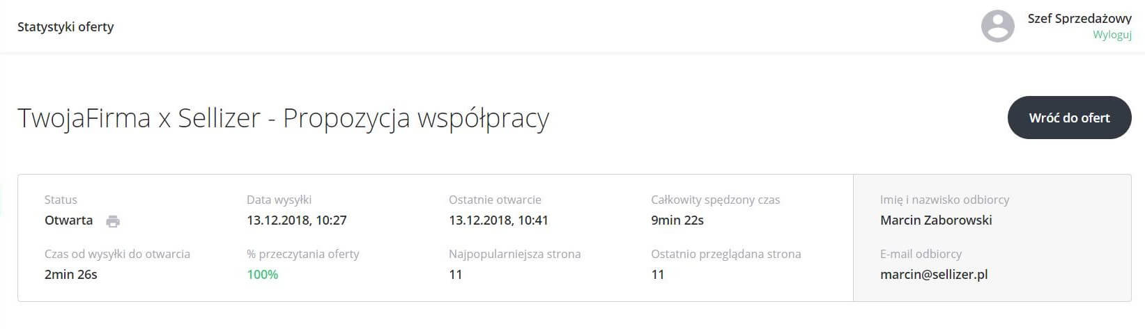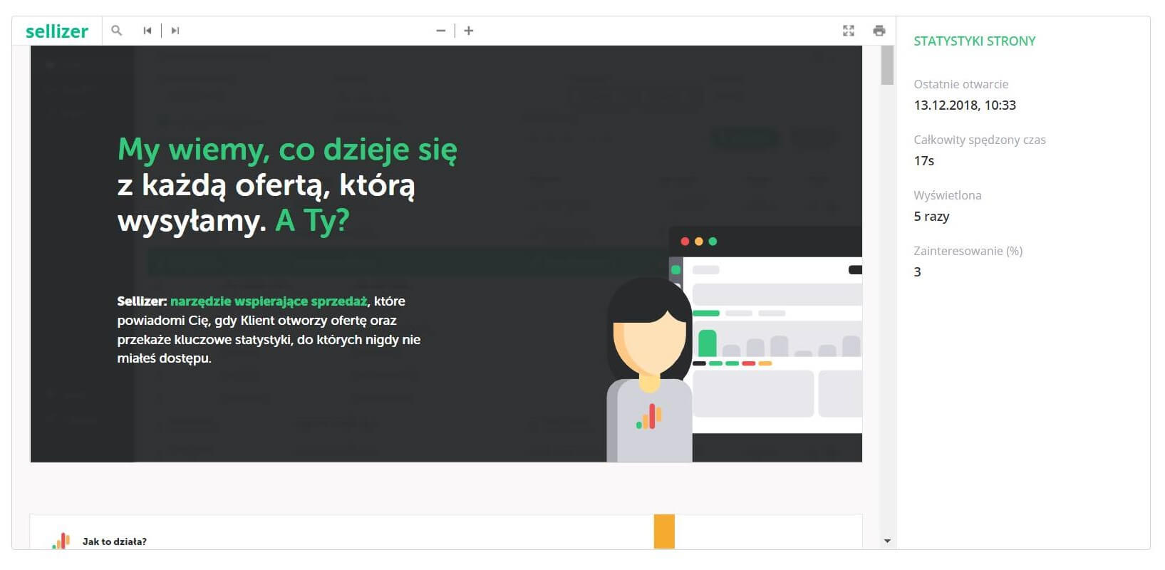 Wskazówka: wykorzystaj tę wiedzę do zainteresowania klienta już od początku rozmowy. Po sprawdzeniu statystyk wiesz, którym stronom oferty klient poświęcił najwięcej czasu, a których nie przeglądnął w ogóle. Dzięki temu wiesz, jak zacząć rozmowę aby go w nią rzeczywiście zaangażować, a nie zniechęcić tematem, który w ogóle go nie interesuje. Dla przykładu, widząc w statystykach oferty, że klient pominął strony 3 i 4 zawierające opis procesu wiesz, że ten temat nie jest dla niego istotny, więc warto poruszyć go w bardziej ogólny sposób i na pewno nie na początku rozmowy.