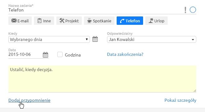 Może się zdarzyć, że kiedy handlowiec wykona telefon do klienta, który właśnie otworzył ofertę, usłyszy, że to nie jest najlepszy moment na rozmowę. Potencjalny klient co prawda zobaczył ofertę, ale coś odciągnęło jego uwagę i chciałby do niej wrócić na spokojnie. Wówczas dobrze jest ustalić termin rozmowy i oczywiście skontaktować się dokładnie wtedy, kiedy ustalono. Co jednak zrobić, jeśli sprzedawca prowadzi równolegle kilka, kilkanaście lub kilkadziesiąt rozmów handlowych? Powinien uzbroić się w narzędzie, które będzie pamiętało za niego o takich działaniach. Na przykład w Livespace CRM może zaraz po rozmowie z klientem dodać sobie zadanie, żeby zadzwonić w ustalonym terminie. Następnie ma możliwość ustawienia przypomnienia o tym zadaniu, aby na pewno nie umknęło jego uwadze.