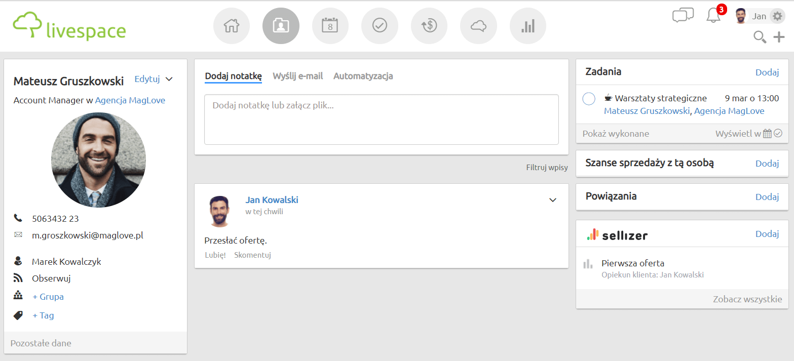 Dlatego warto ten kontakt zoptymalizować. Handlowiec może bowiem wysłać ofertę do klienta przy pomocy integracji Sellizer z Livespace CRM i mieć wgląd w to, jakie oferty klient otrzymał, czy je otworzył i dopiero wtedy skontaktować się z propozycją ustalenia terminu rozmowy. Dzięki temu handlowiec nie musi wykonywać wielu niepotrzebnych telefonów do potencjalnego klienta, a klient dostaje telefon wtedy, kiedy jest gotowy do omówienia oferty.